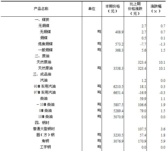 導(dǎo)語:國家統(tǒng)計(jì)局公布了部分重點(diǎn)企業(yè)主要工業(yè)品出廠價(jià)格變動(dòng)情況的詳細(xì)數(shù)據(jù),煤炭價(jià)格上漲0.7%,原油價(jià)格上漲10.1%等。