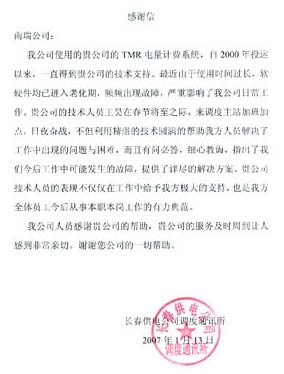 吉林長春供電公司致南瑞感謝信