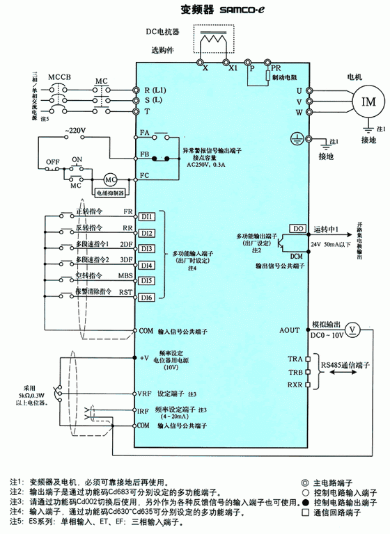 一、Samco-e系列迷你型的特點 ● 外形小型化設計,安裝方便。 ● 標準配備調節(jié)頻率用電位器,操作簡便。 ● 可方便地將操作面板引出。 ● 具有6路外部輸入多功能控制端子。 ● 含V/f分離功能,適用于特殊的應用場合。 ● 全系列均含制動單元(制動電阻為選購件)。 ● 具有過電流、過載、欠壓、過壓、輸入及輸出缺相、散熱器過熱等多種保護功能。 ● 具有自動節(jié)能功能,可實現(xiàn)電視高效率節(jié)能運轉。 ● 標準配備RS485通訊接口。 ● 內(nèi)置PID控制功能,便于實現(xiàn)閉環(huán)控制。 ● 變更數(shù)據(jù)查詢功能:可以簡單檢索變更了的數(shù)據(jù)。 ● 數(shù)據(jù)的復制功能(需選購SAMCO-Um05操作面板)。 二、端子接線圖