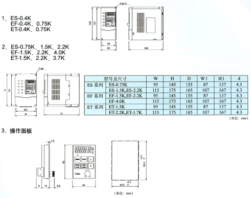 ※ 1:額定容量為200V系列時輸出電壓220V時,400V系列為輸出電壓是400V時的容量。 ※ 2:當輸入電壓為AC400V以上時,將根據(jù)輸出功率降低額定電流。 ※ 3:載波頻率的最大值根據(jù)變頻器容量及運轉狀態(tài)而變化。 ※ 4:最大輸出頻率為5V、10V、20mA時的頻率。 ※ 5:可適應運輸?shù)榷虝r間的溫度。 ※ 6:請將載波頻率設定為cd051=9以下的設定下使用。 注:本規(guī)格參數(shù)僅供參考,如有變化恕不另行通知。 五、安裝尺寸
