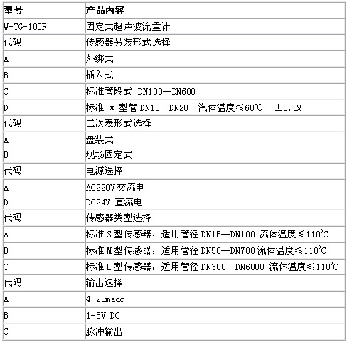 例:W-TG-100F-A-B-A-B-A表示為固定式超聲波流量計外夾式,現(xiàn)場固定,AC220V供電,M型傳感器,輸出4-20mA標準電流信號