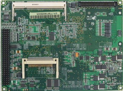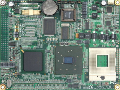 NORCO-7736主板所有接口均為IDC插座。IDE接口、CF卡、SO-DIMM設(shè)計(jì)在主板的背面,Audio、USB、VGA、KB、COM、Power、前面板接口均為2.54mm 插針直接與底板相連。合理的布局使主板結(jié)構(gòu)更加嚴(yán)謹(jǐn),八層的PCB板尺寸僅為161mm X 120mm,大大節(jié)省了車載設(shè)備的整體使用空間。