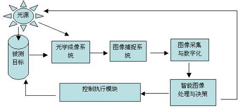 目前,國內(nèi)機器視覺的應(yīng)用研究如火如荼,但不論是將機器視覺應(yīng)用于工業(yè)、農(nóng)業(yè)、軍事、科學(xué)研究的各項領(lǐng)域,都離不開機器視覺開發(fā)平臺的搭建。機器視覺是一項綜合技術(shù),包括圖像處理、機械工程技術(shù)、控制、電光源照明、光學(xué)成像、傳感器、模擬和數(shù)字視頻技術(shù)、計算機軟硬件技術(shù)(圖像增強和分析算法、圖像卡、I/O卡等)這些技術(shù)在機器視覺中是并列關(guān)系,相互協(xié)調(diào)應(yīng)用才能構(gòu)成一個完整的工業(yè)機器視覺應(yīng)用系統(tǒng)。一個典型工業(yè)機器視覺系統(tǒng)如下圖所示: