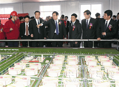 5月11日上午,中國石化天津原油商業(yè)儲(chǔ)備基地開工,有關(guān)領(lǐng)導(dǎo)正在觀看商儲(chǔ)基地模型。