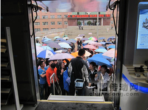 當(dāng)展車駛?cè)爰涯舅勾髮W(xué)時,天空中飄起了小雨,可是師生們依然熱情如故,在雨中排起長隊等候參觀,參觀過后,有學(xué)生激動的說:“能親手摸摸